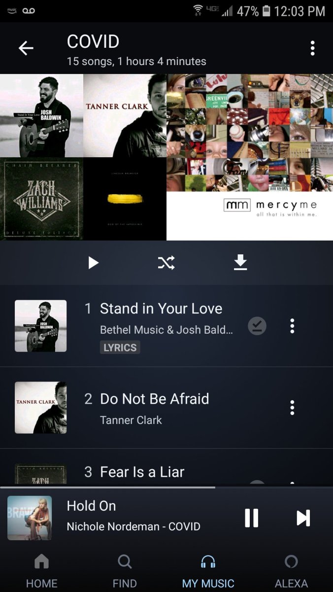 - Created a Playlist…just this morning I decided it was time to create a COVID-19 playlist. My list includes songs that address fear directly, bring God into the picture, and focus on the hope of eternity. Pretty sure I’ll be playing it daily.